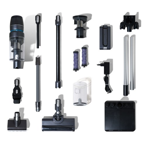 자동충전 거치대가 기본 구성품으로 제공되어 사용 후 청소기를 거치대에 세워두기만 하면 자동으로 충전이 시작됩니다. 매번 충전 케이블을 연결할 필요가 없어 번거로움이 없고, 깔끔하게 보관할 수 있다는 점도 큰 장점입니다.
